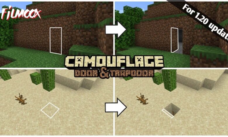 ” ماين كرافت – minecraft “مود Camouflage Door ، أضاف هذا الإضافة أبوابًا مخصصة مختلفة وأبوابًا مخصصة مع نمط ألوان الكتل الأساسية لجعل الباب والباب العلوي تمويهيًا، حتى يمكنك بسهولة إنشاء غرفة مخفية باستخدام هذه الأبواب. يمكن استخدام معظم الكتل لصنع الأبواب، وبالتالي يمكنك إخفاء قاعدتك في أي بيئة.